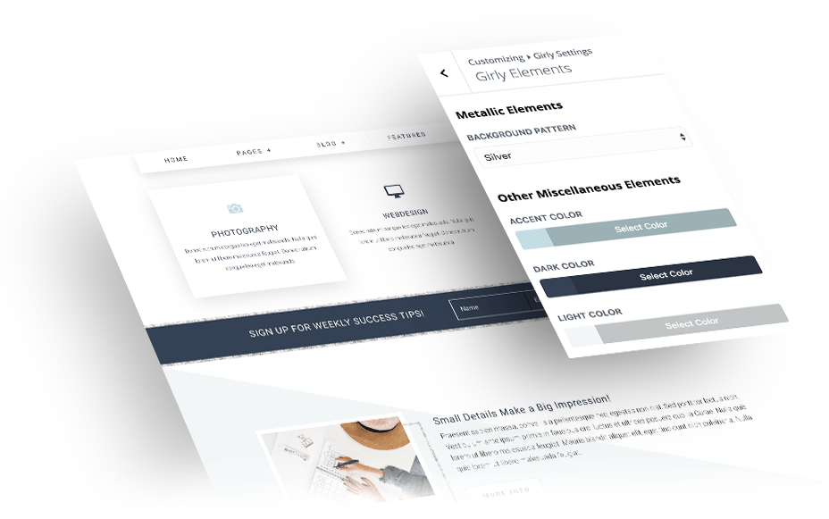 You can set your color scheme in Theme Options and change all the colors globally in a matter of seconds. If you prefer a more detailed hands-on approach, you can use the extensive customization options to edit page elements separately. You will be able to see an instant live preview in the Theme Customizer. You’ll love how fun and easy it is to make the Girly theme your own!